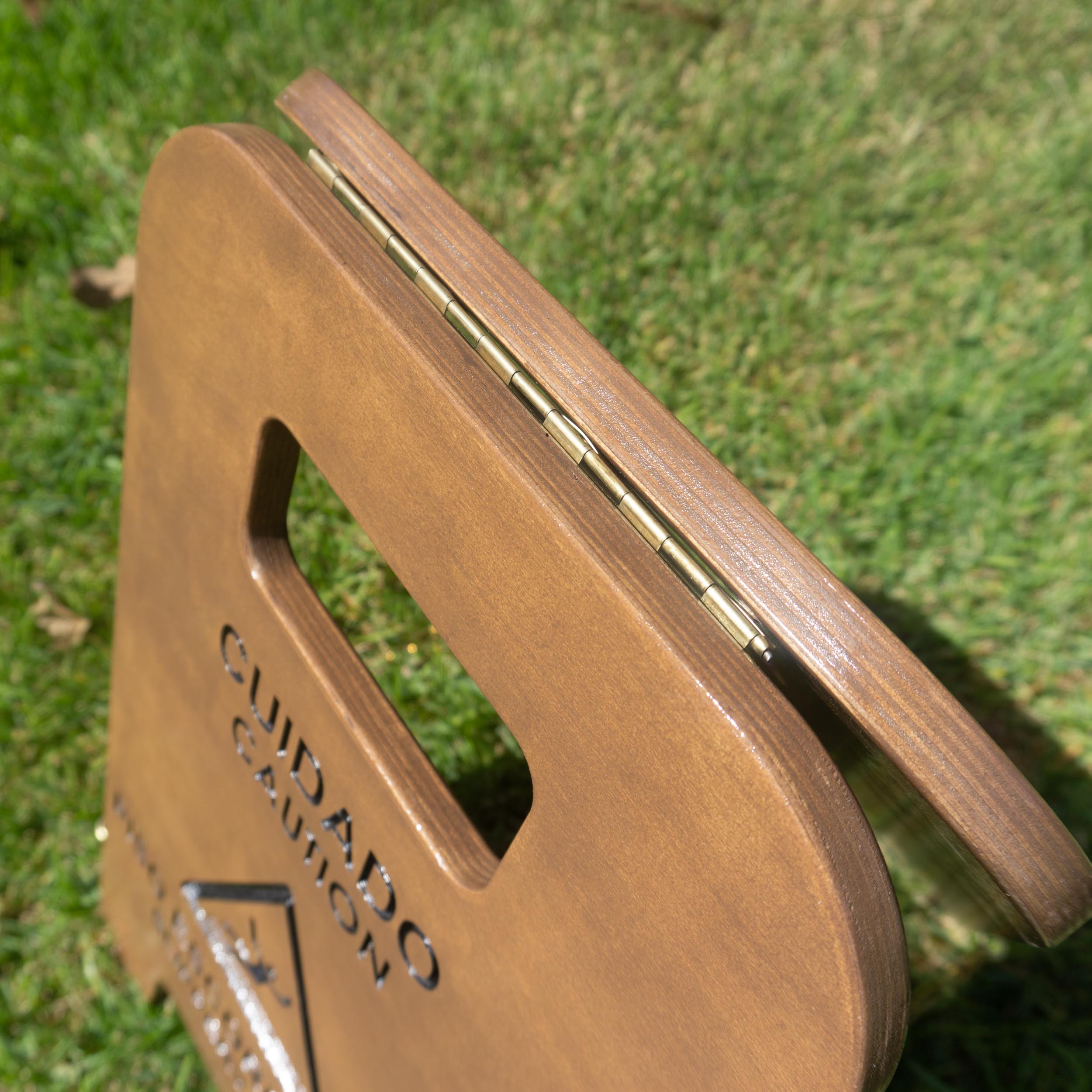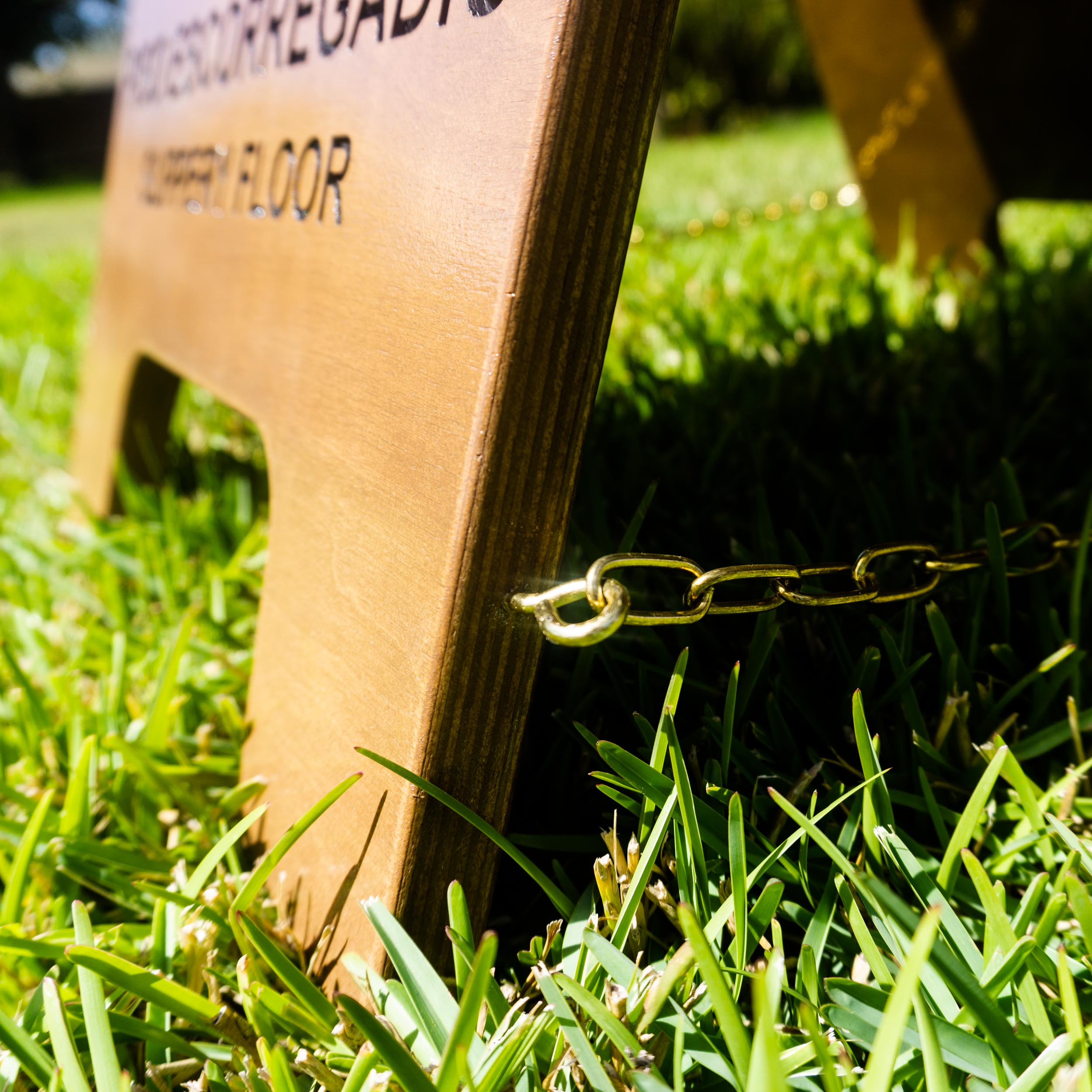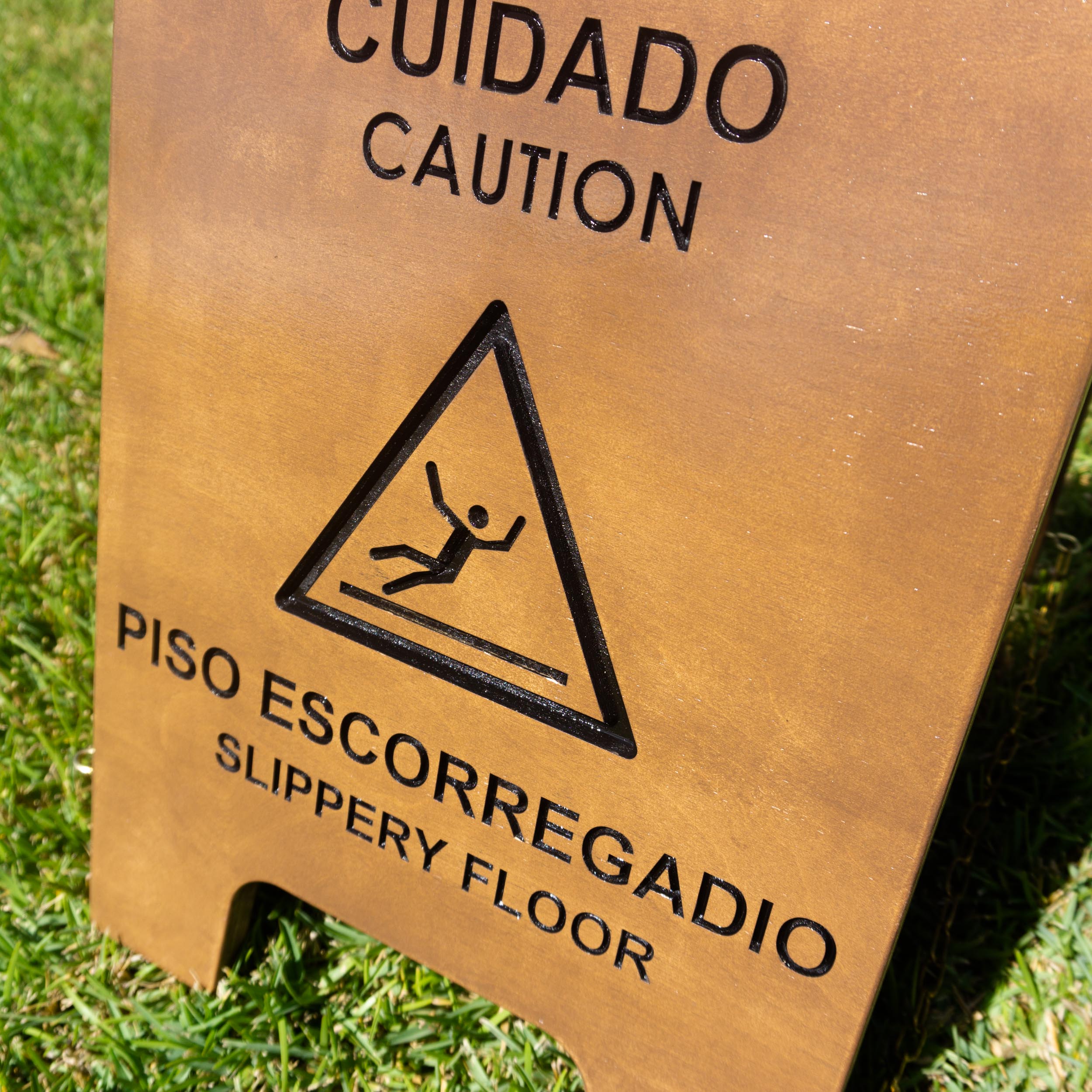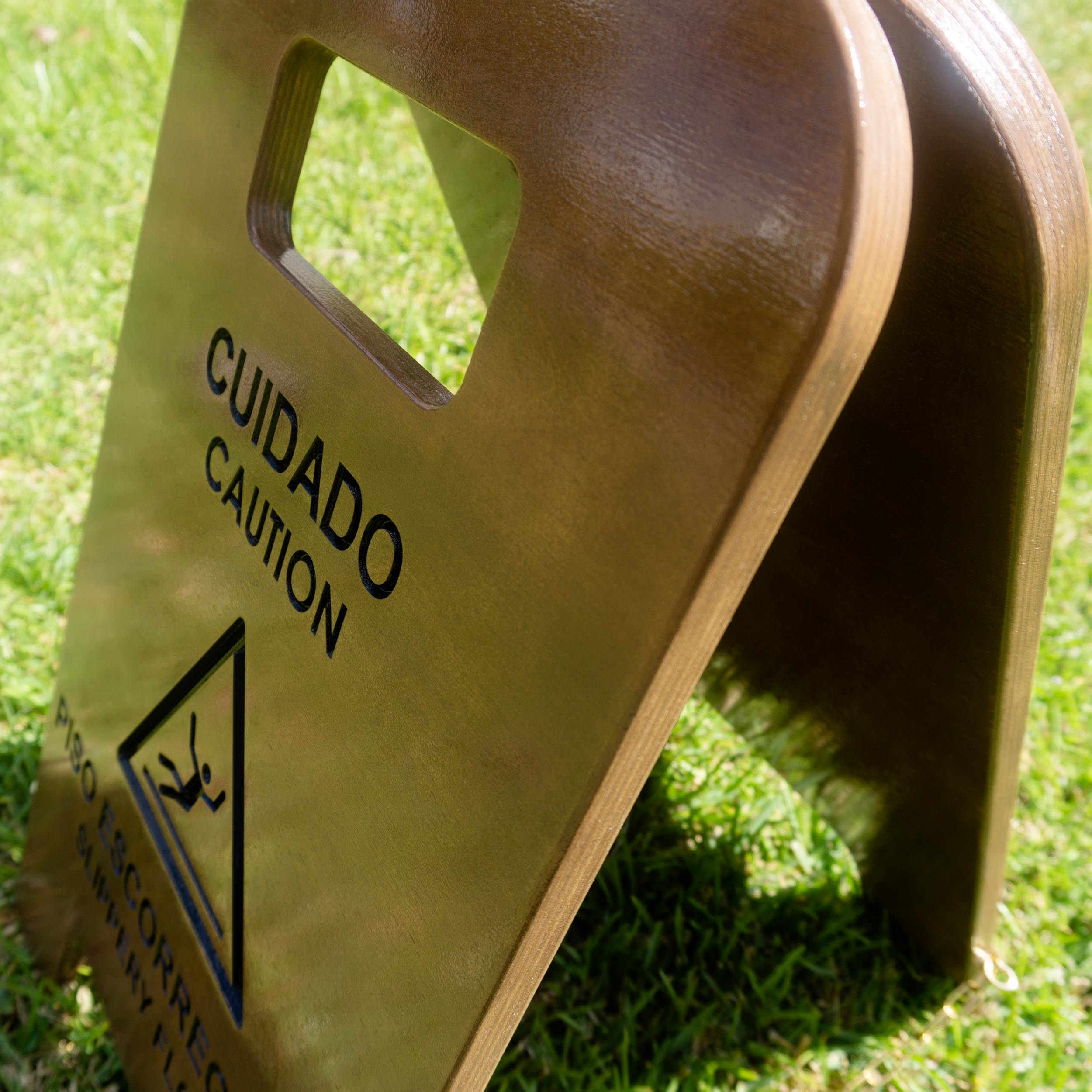 Placa de sinalização “Piso Molhado” ou “Piso Escorregadio” em madeira maciça, ferragens em ferro latonado. Ideal para restaurantes e hóteis.